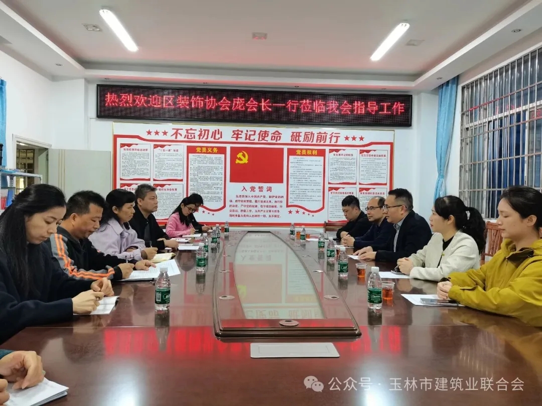 11月24日,廣西建筑裝飾協(xié)會(huì)會(huì)長(zhǎng)龐耀國(guó)率協(xié)會(huì)核心團(tuán)隊(duì)一行蒞臨玉林市建筑業(yè)聯(lián)合會(huì)開展黨建共建及相關(guān)行業(yè)交流活動(dòng)。我會(huì)秘書長(zhǎng)及秘書處相關(guān)部門負(fù)責(zé)人熱情接待,雙方圍繞行業(yè)發(fā)展熱點(diǎn)議題展開深入交流。